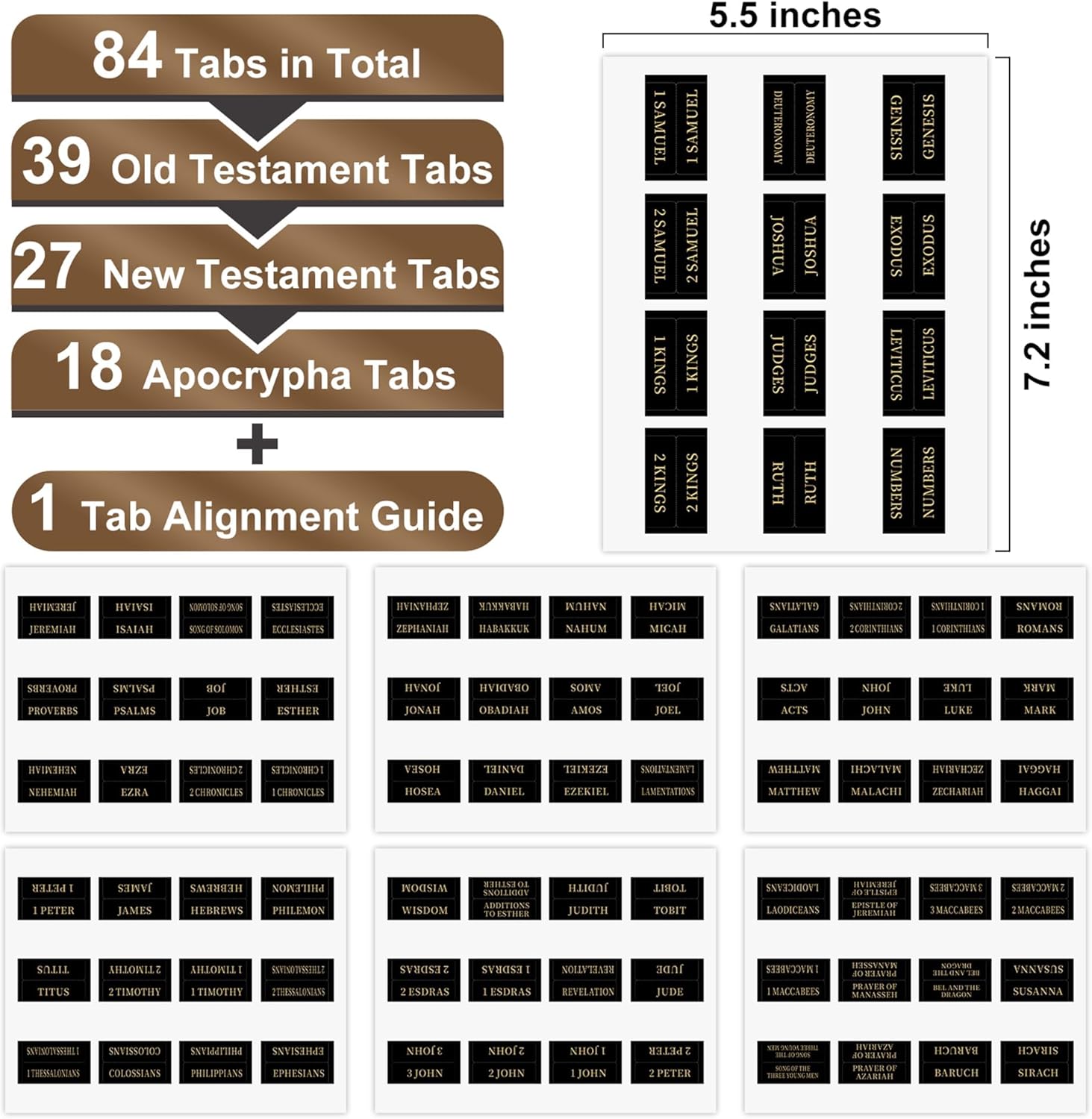 Bible Index Tabs, black with gold foil lettering offer an elegant, practical solution for quick and easy Bible navigation. These durable, self-adhesive tabs provide a classic look while helping users of all ages rapidly find a specific Book of the Bible.