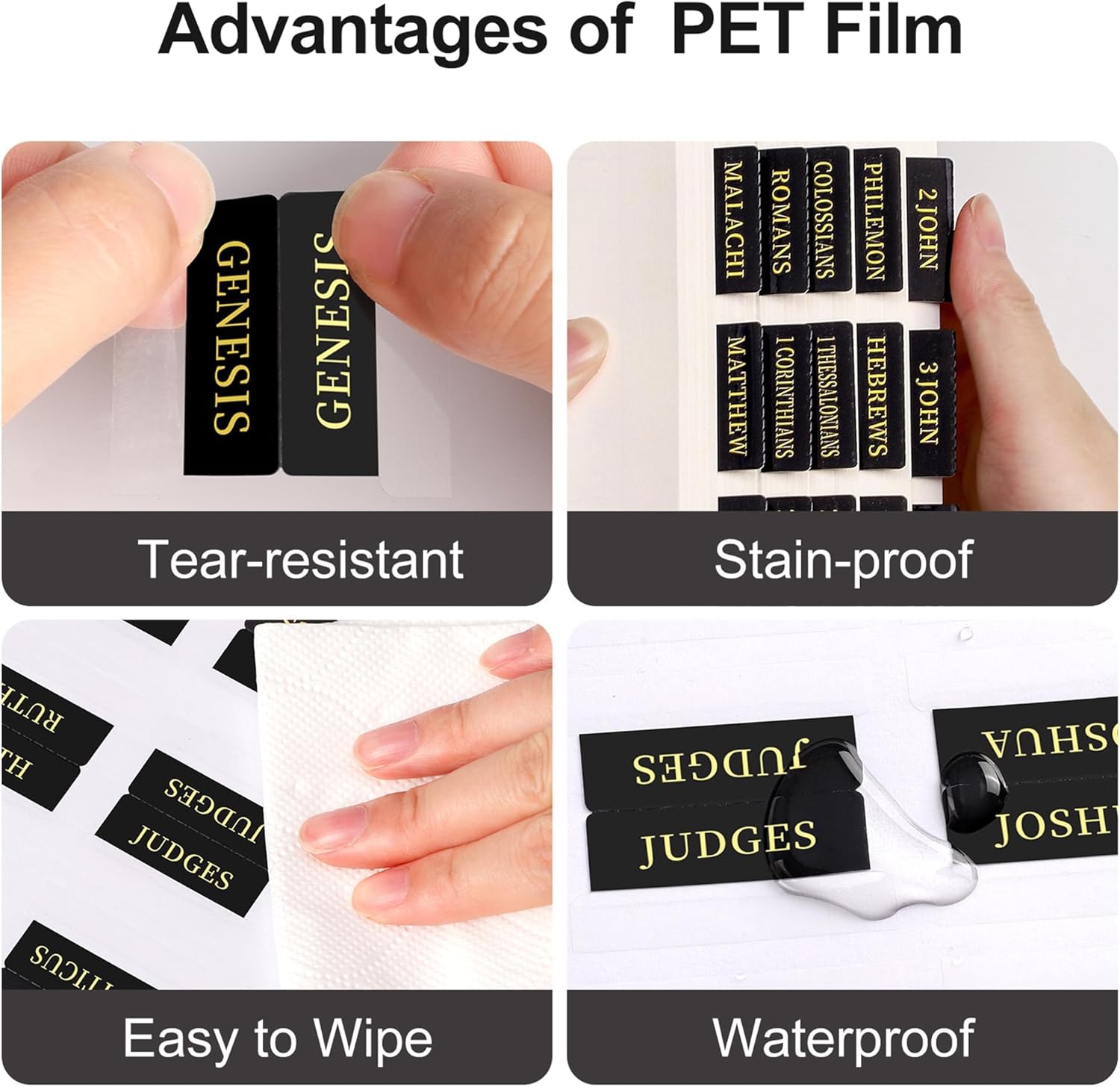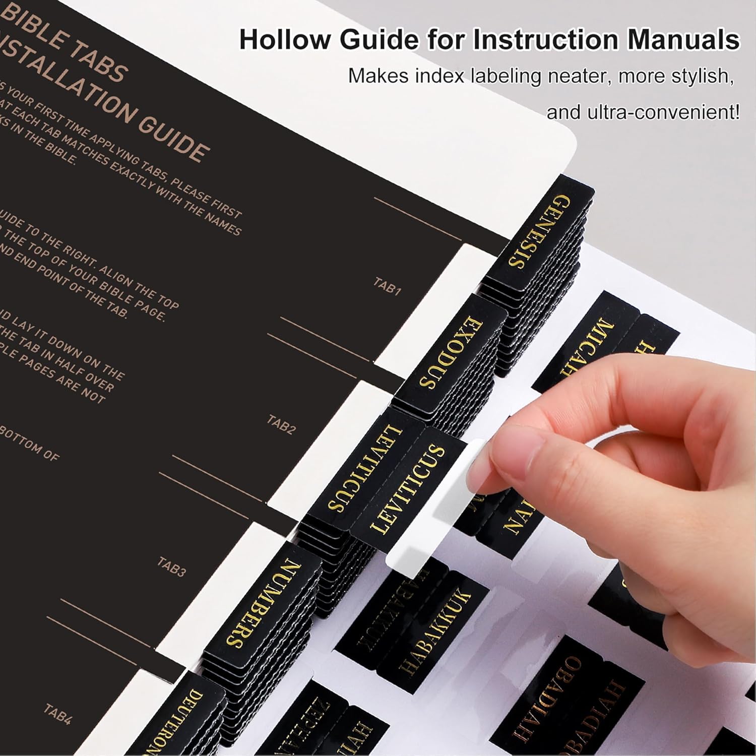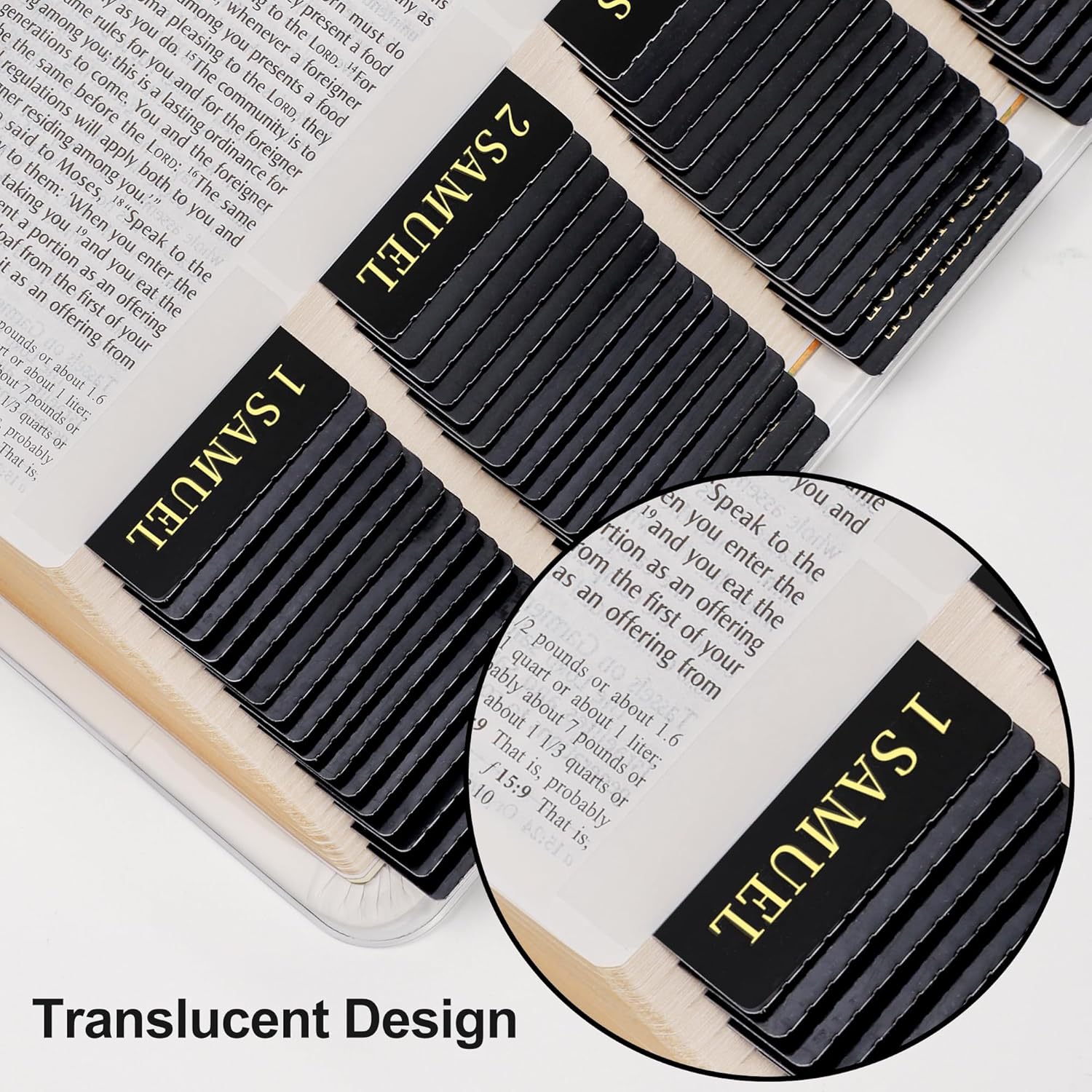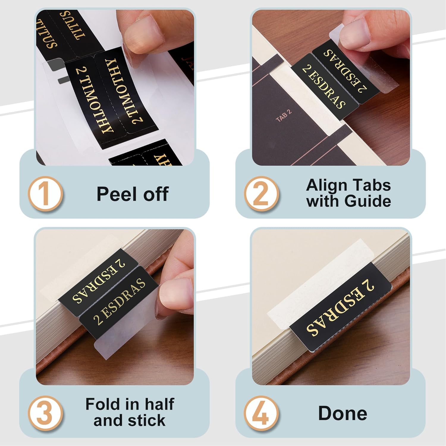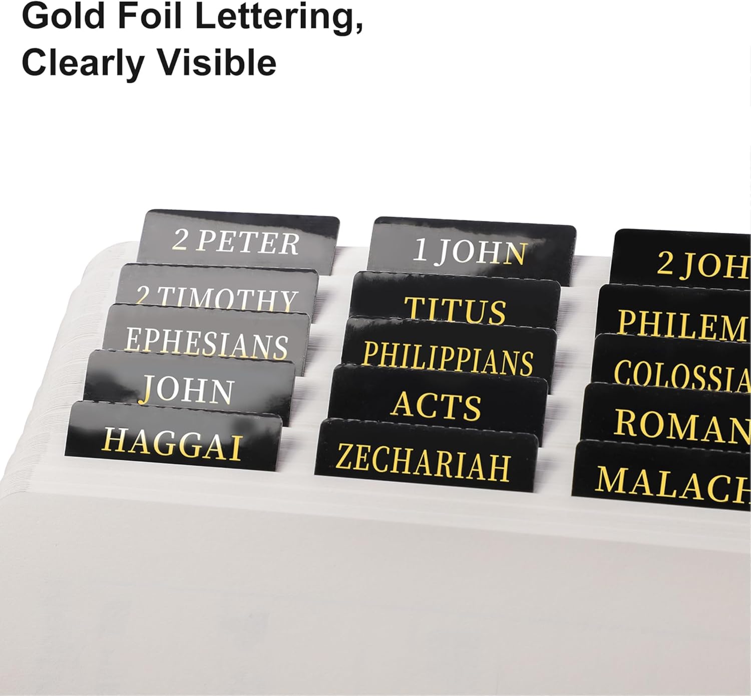 Bible Index Tabs, black with gold foil lettering offer an elegant, practical solution for quick and easy Bible navigation. These durable, self-adhesive tabs provide a classic look while helping users of all ages rapidly find a specific Book of the Bible.