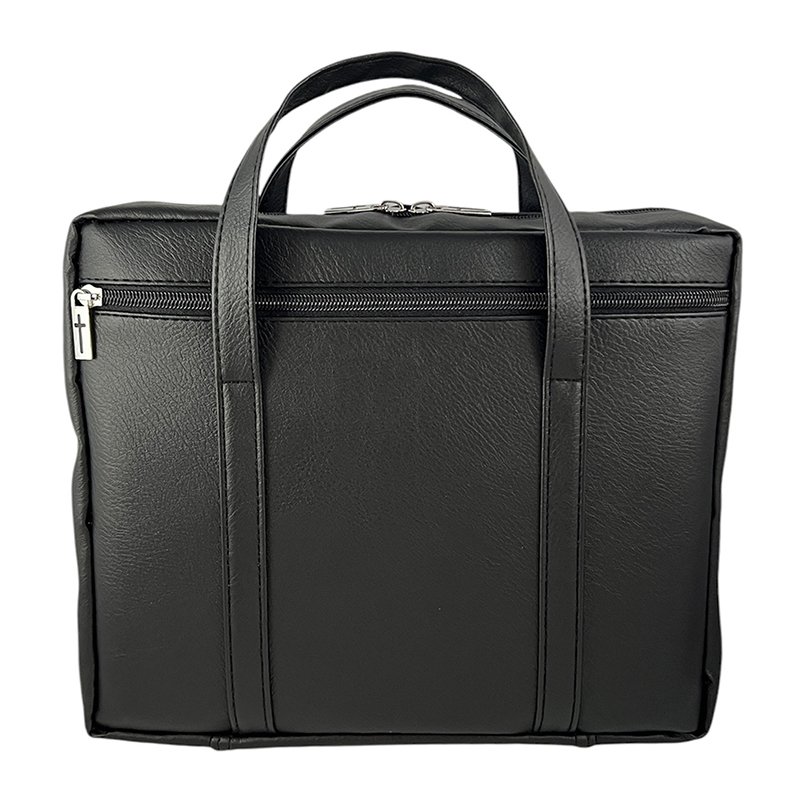 Front zip pocket Cross engraved zipper pull Dual purse style carrying handles Interior pen loop and ribbon bookmark Our supplier’s exclusive design
